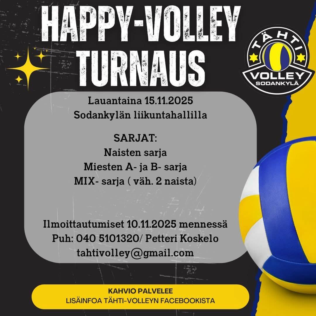 Lauantaina 20.4.2024 Sodankylän Liikuntahallilla pelataan perinteinen Happy Volley turnaus. Sarjoina miehet A ja B sekä naisten sarja. Tervetuloa katsomaan ja kannustamaan!