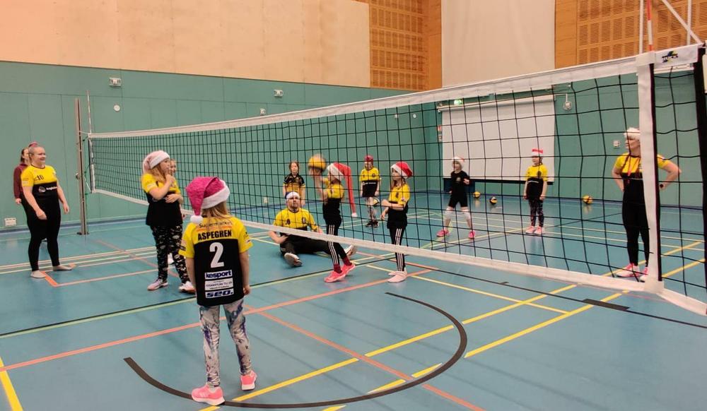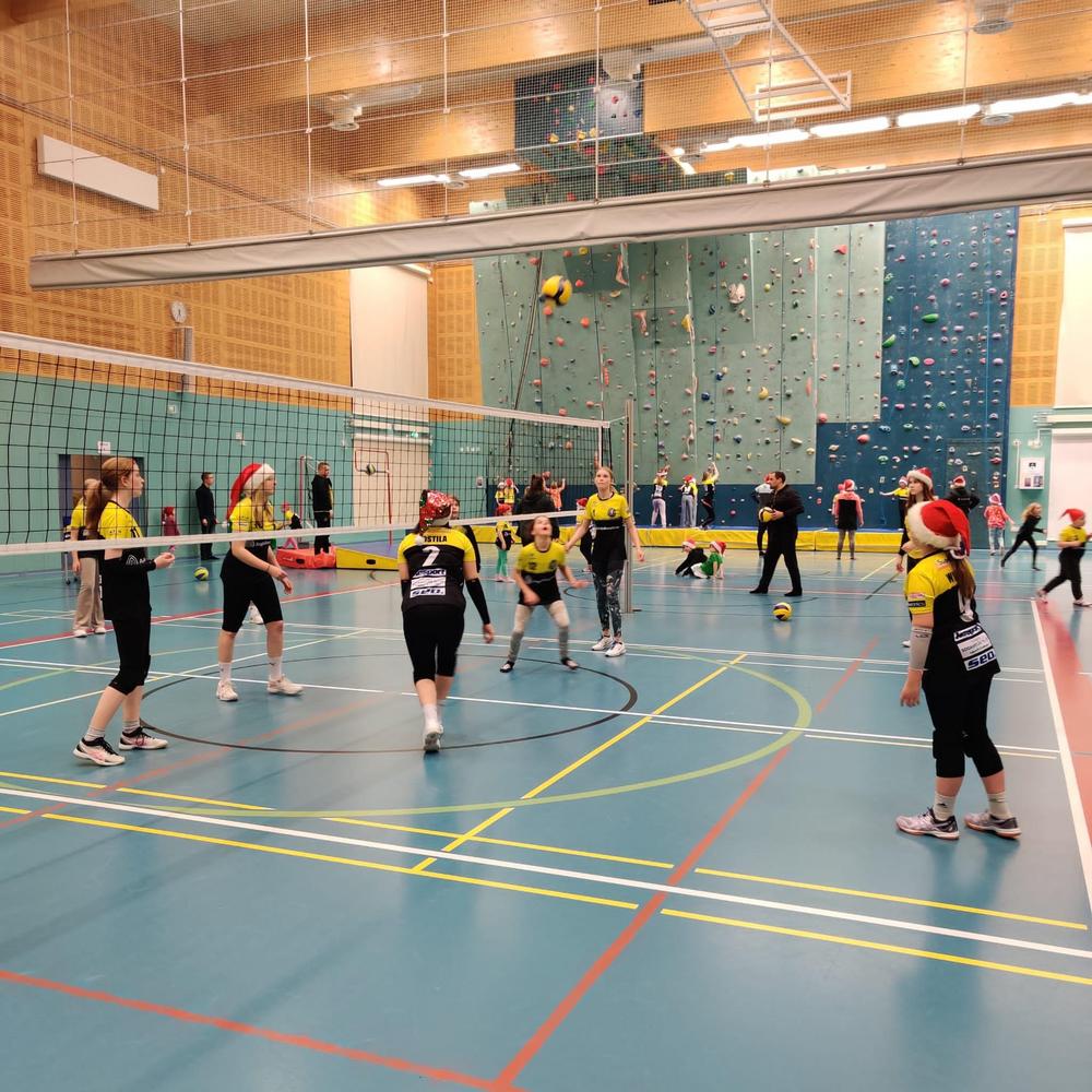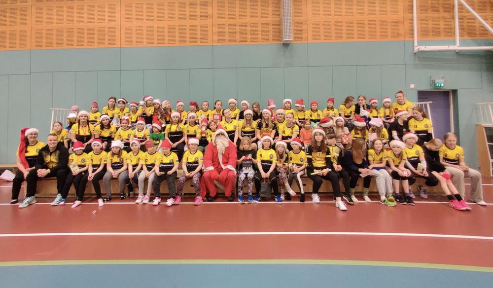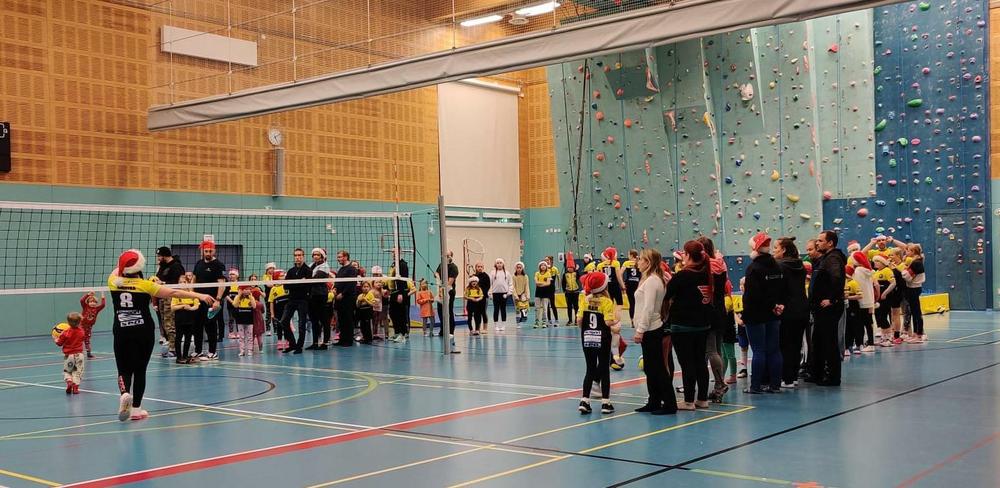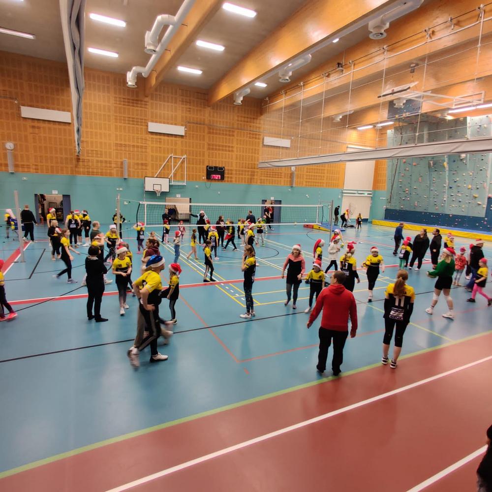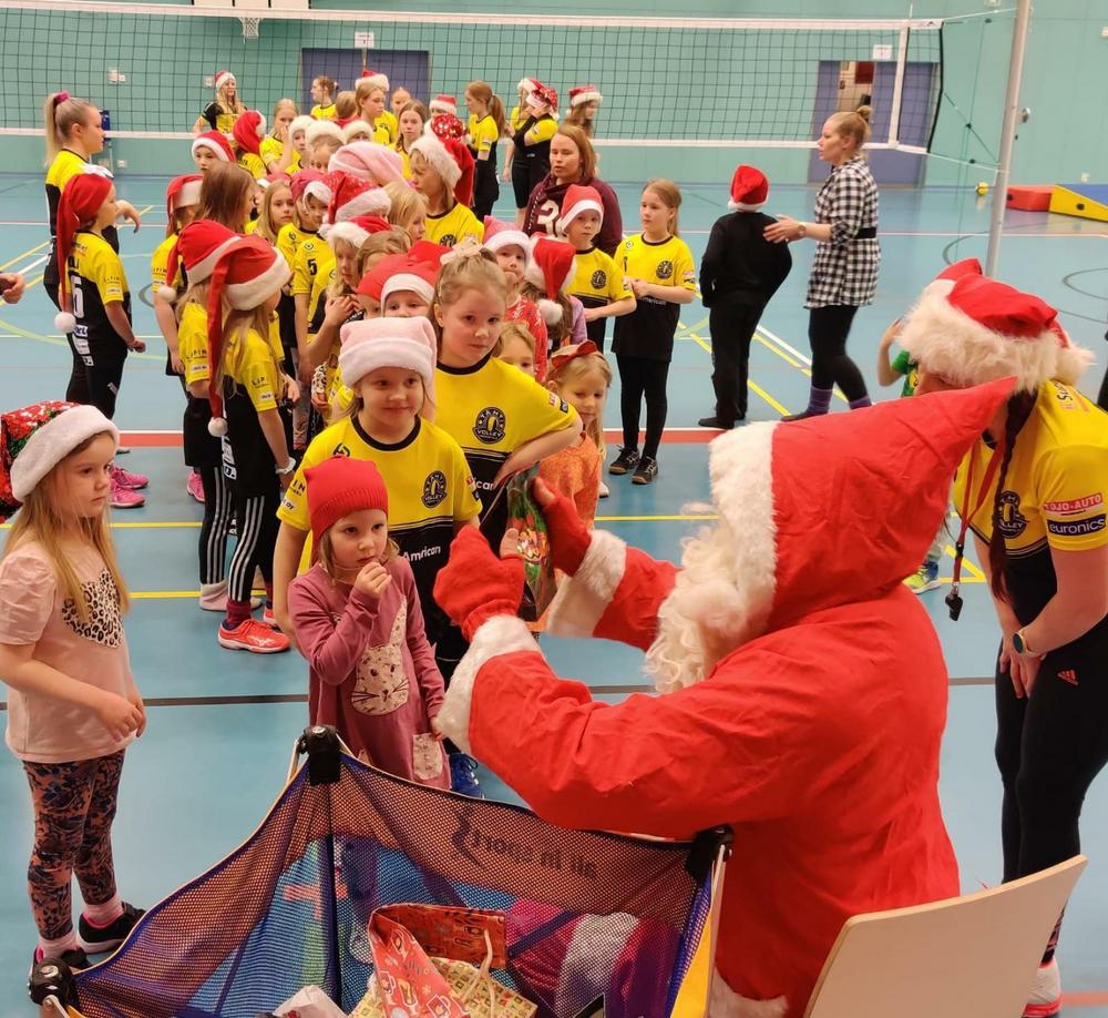 Joulupukkikin piipahti hallilla ja lentopallojuniorit laulaa kajauttivat kiitokseksi Joulupuu on rakennettu.