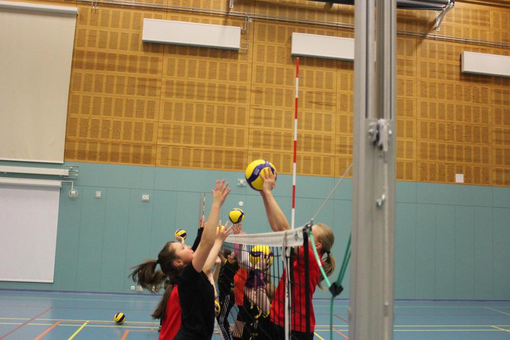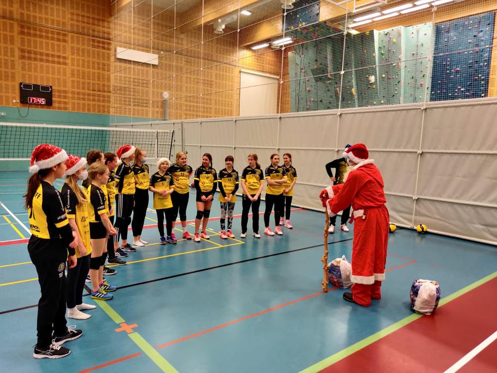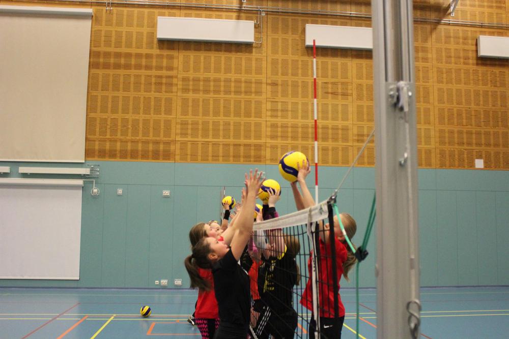 Lentopallokoululaiset, valmentaja Marja-Leena Engelberg ja C-tytöt.